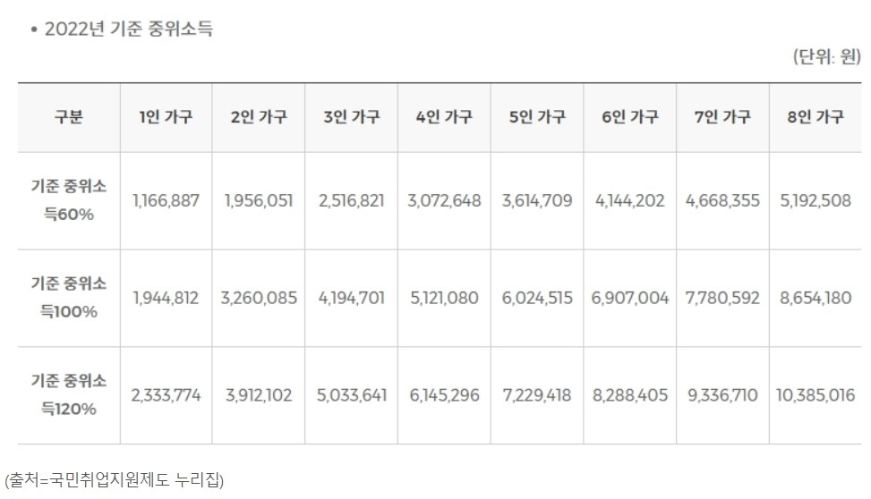 국민 취업지원제도 2유형의 중장년층 기준 중위소득 100%는 아래와 같습니다