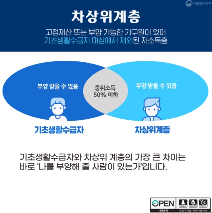 즉, 차상위계층은 기초생활 수급을 받을 정도로 생계가 어렵진 않지만 언제라도 수급을 받을 수 있는 상황이 될지도 모르는 계층을 이야기합니다.