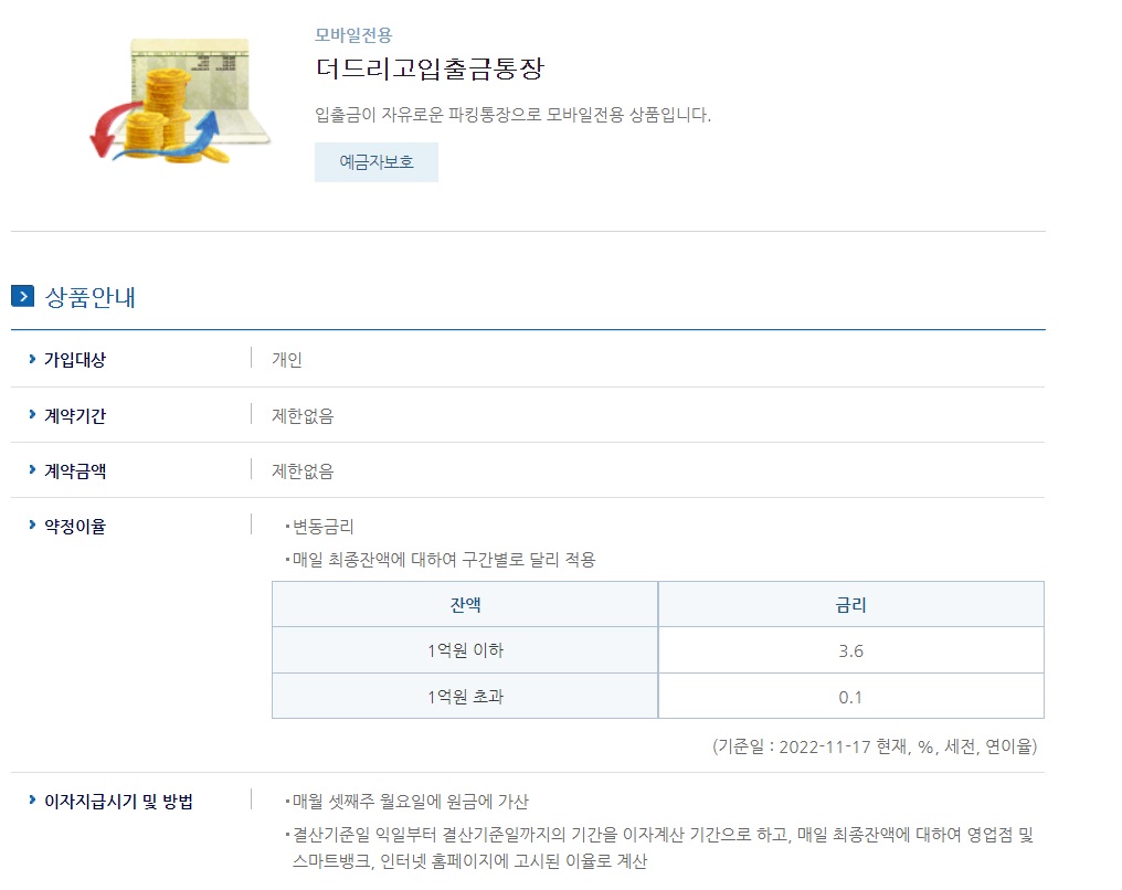 입출금이 자유로운 파킹통장으로 모바일전용 상품입니다.