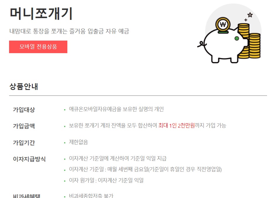 가입금액 : 보유한 쪼개기 계좌 잔액을 모두 합산하여 최대 1인 2천만원 까지 가입 가능