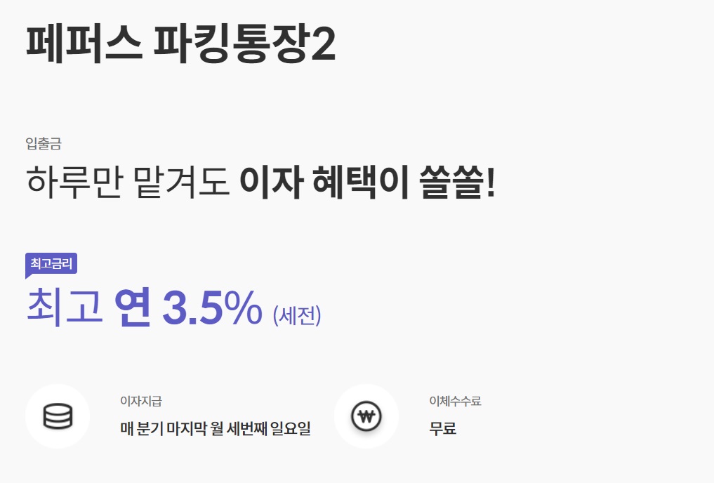 페퍼스 파킹통장2는 하루만 맡겨도 이자 혜택이 쏠쏠한 통장입니다.