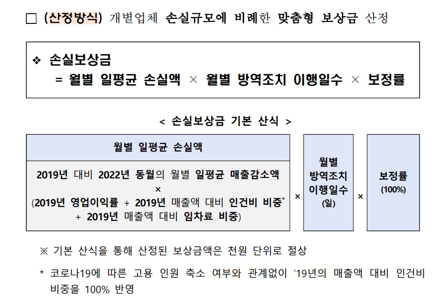 <월별 일평균 손실액 x 월별 방역조치 이행일수 x 보정률을 곱한 값> 으로 보정률은 100%입니다.