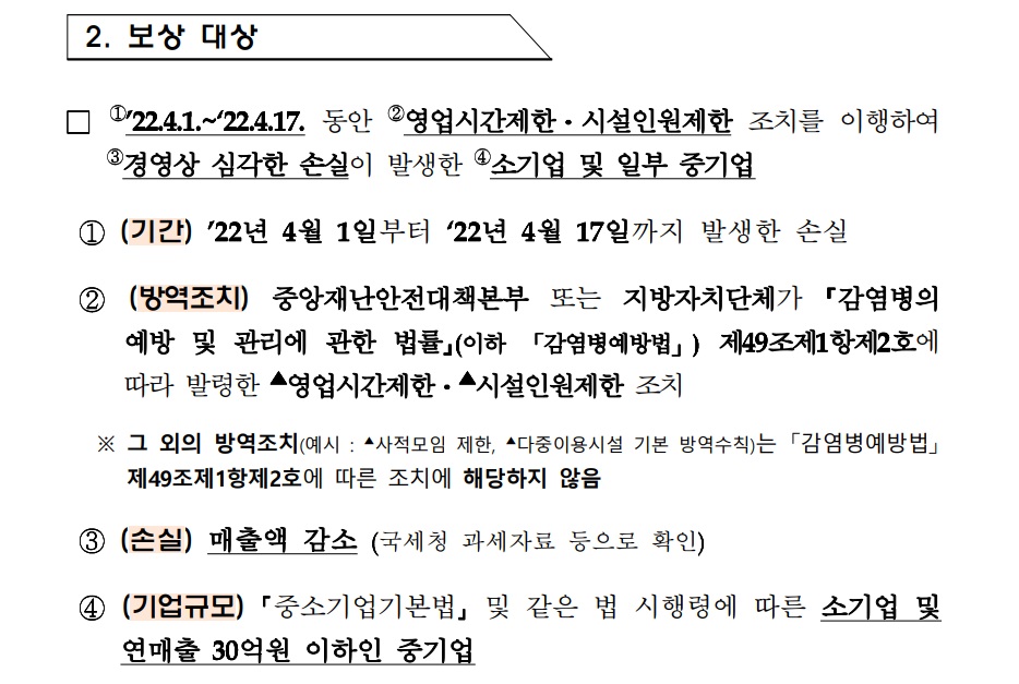 1. 22년 4월 1일 ~ 22년 4월 17일까지 정부의 코로나19 방역조치로 매출이 감소한 소상공인과 중소기업