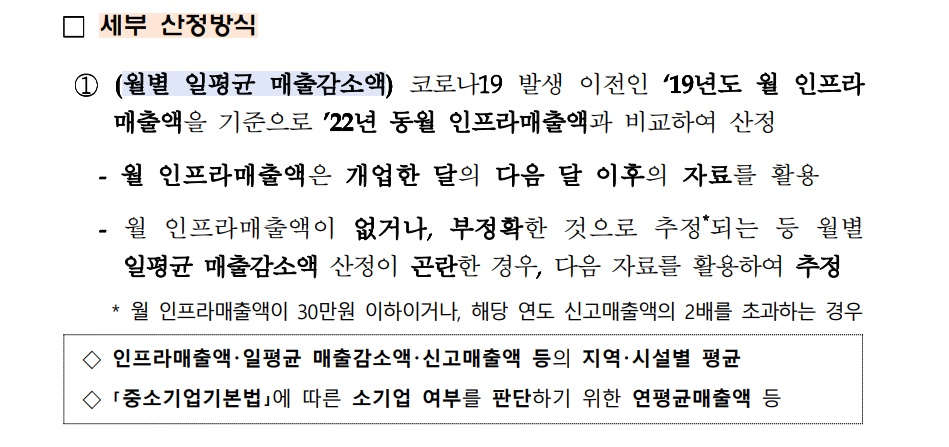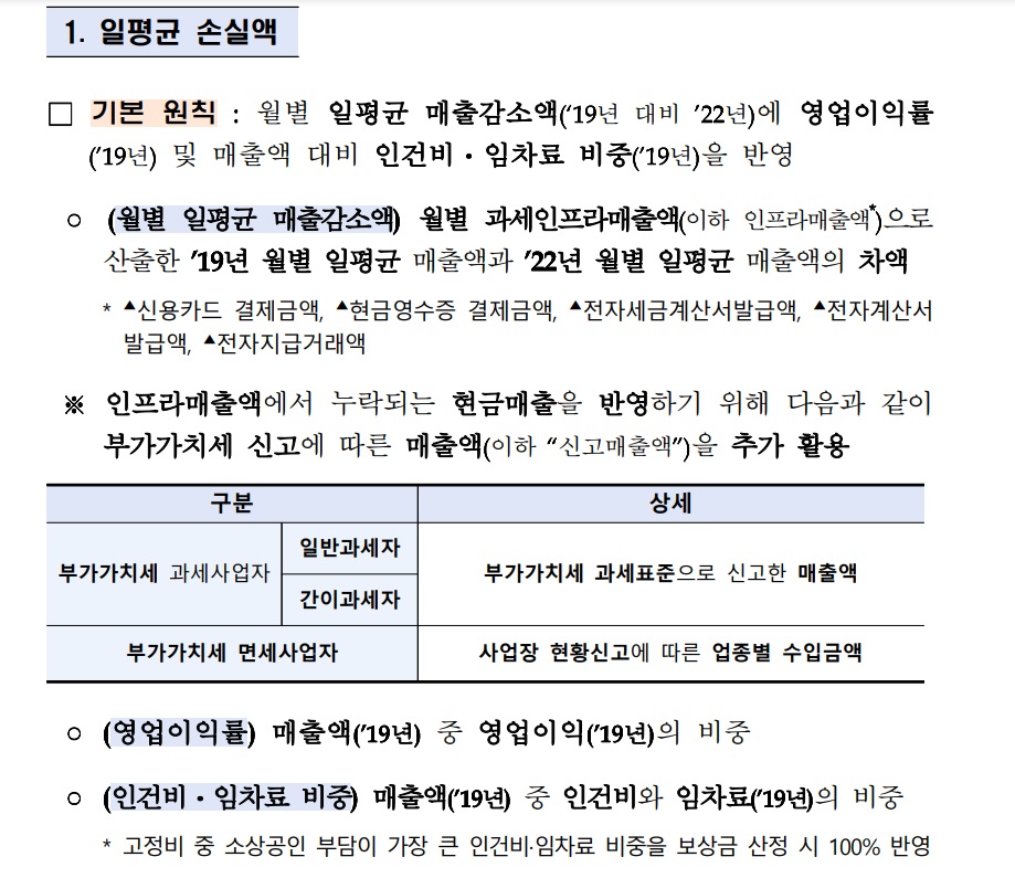 이 중 월별 일평균 손실액은 2019년 대비 2022년 동월의 월별 일평균 매출감소액x(201년 영업이익률+2019년 매출액 대비 인건비 비중 + 2019년 매출액 대비 임차료비중)을 곱한 값입니다.