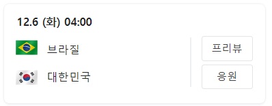 우리 대한민국팀의 월드컵 16강 대진표 상대는 브라질이며, 경기일정은 12월 6일(화) 04:00 ~ 06:00까지 입니다.