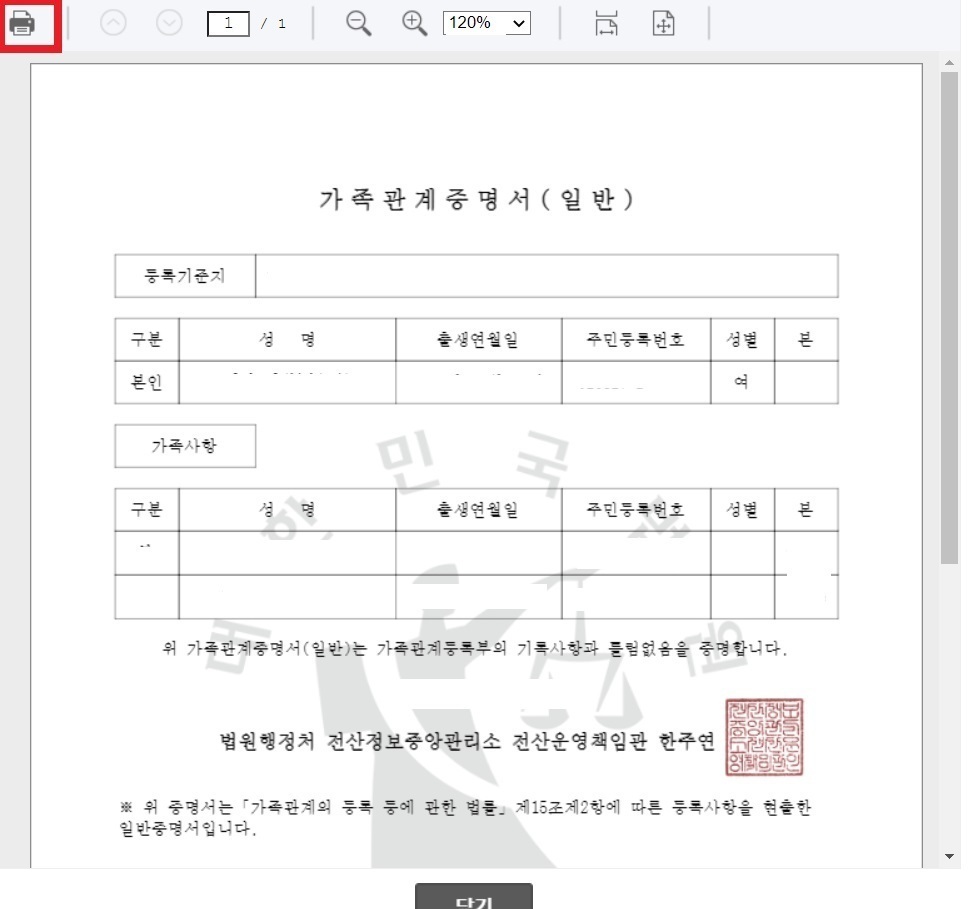 신청하기를 누르면 가족관계증명서 PDF파일이 뜹니다.