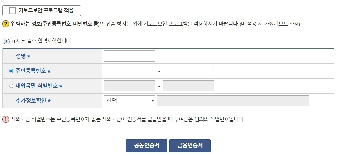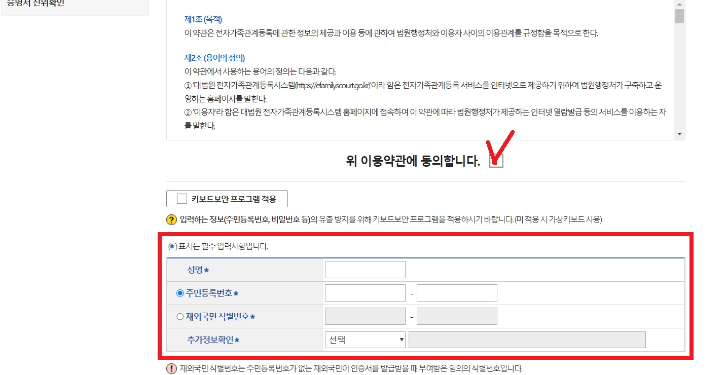 그 후 약관동의 후 성명, 주민등록번호 등 개인정보를 입력해주세요.