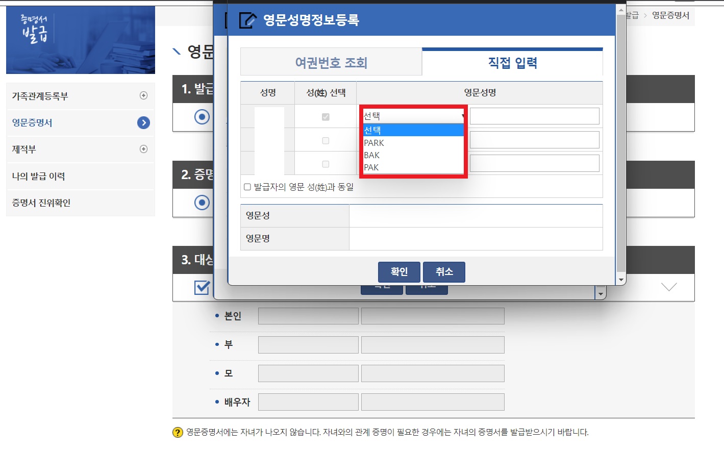 선택을 누르면 아래로 주민등록상 부, 모, 배우자 성명이 뜨니 아무나 눌러주시면 됩니다.