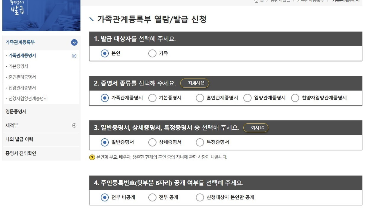 특정증명서의 경우 노출하고 싶지 않은 정보가 있을 경우 본인과 본인이 선택한 대상자만 가족관계증명서에 포함되기에 각 목적에 맞게 가족관계증명서를 선택하시면 됩니다.