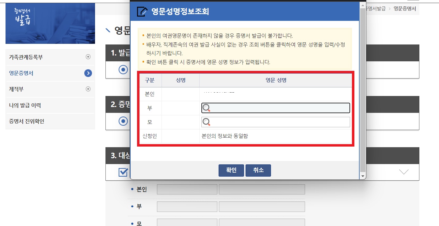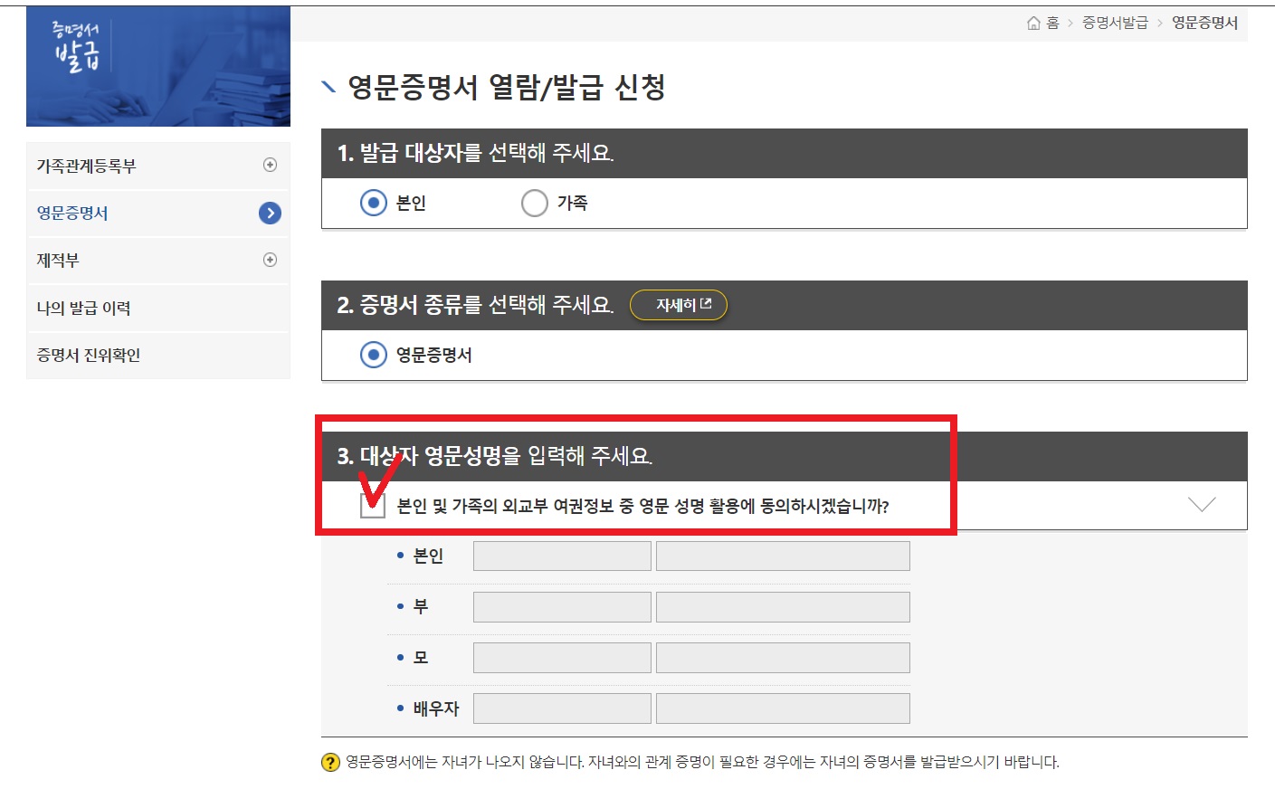 국문 가족관계증명서와 별 다를 건 없지만, 3. 대상자 영문성명을 입력해주세요 항목에 동의를 해주시고요.