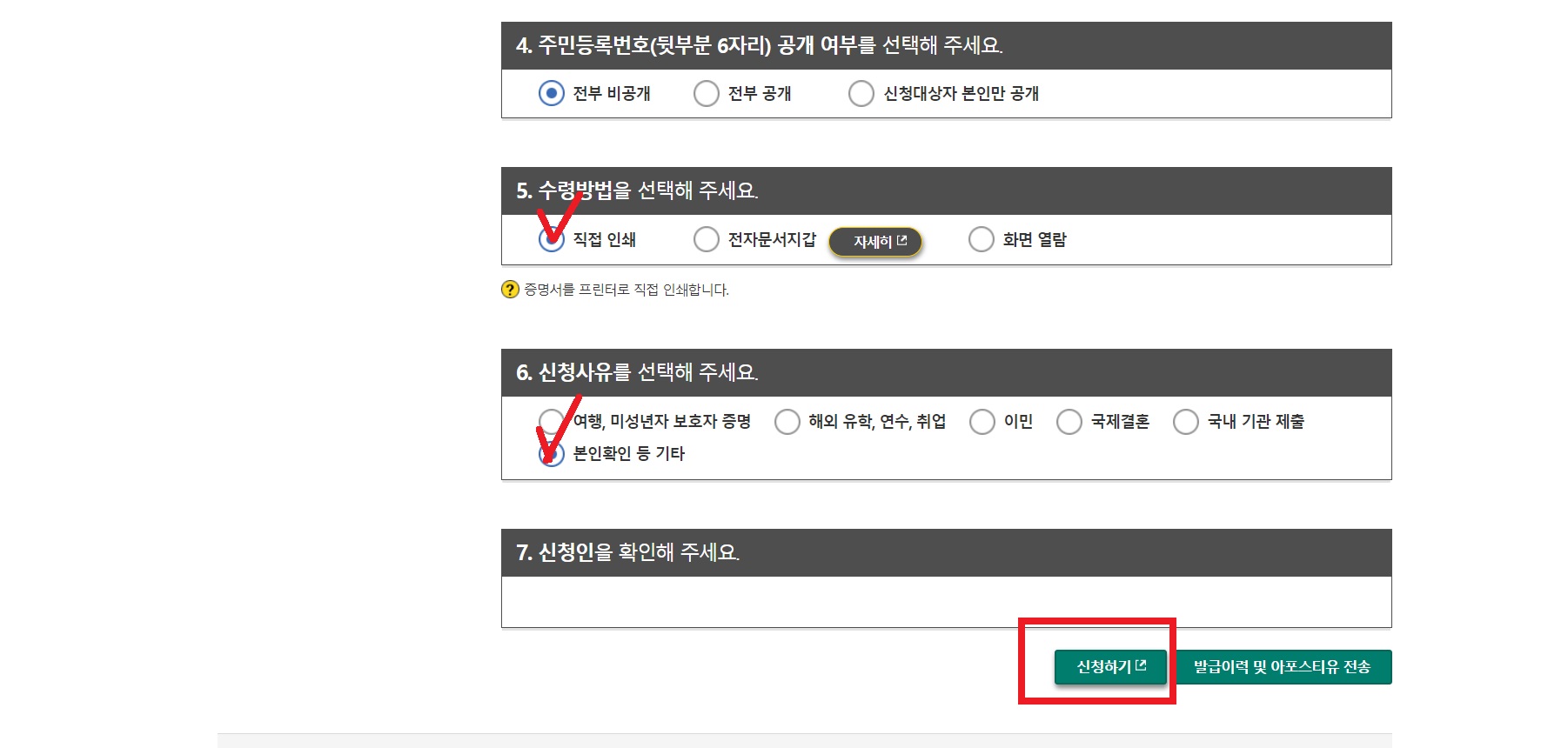 직접 인쇄, 신청사유를 선택 한 후 신청하기를 눌러줍니다.