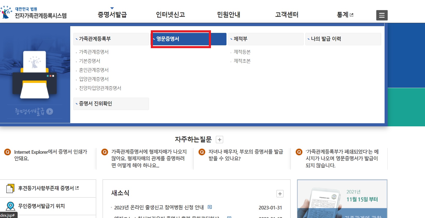영문으로 된 가족관계증명서 역시 인터넷발급이 가능한데요,