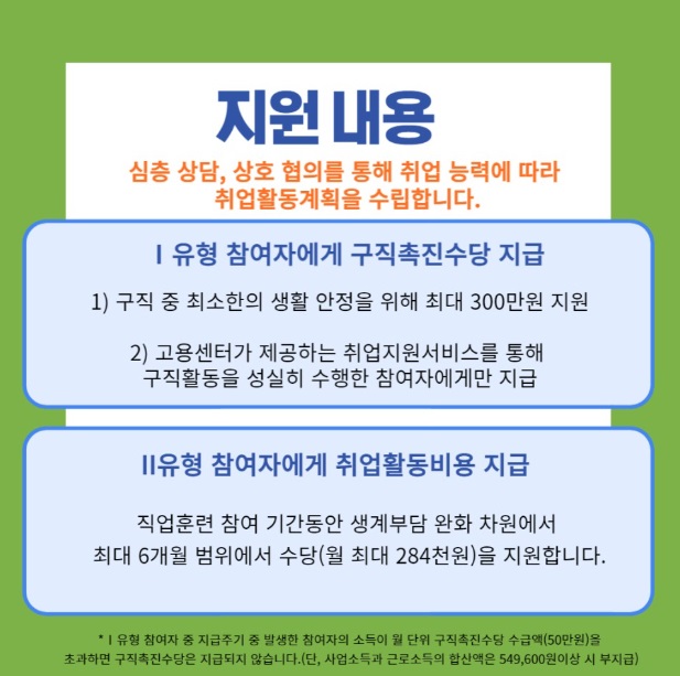 국민취업지원제도 서비스는 지원자의 소득과 재산에 따라 I유형과 Ⅱ유형으로 지원대상자가 나뉘게 됩니다.