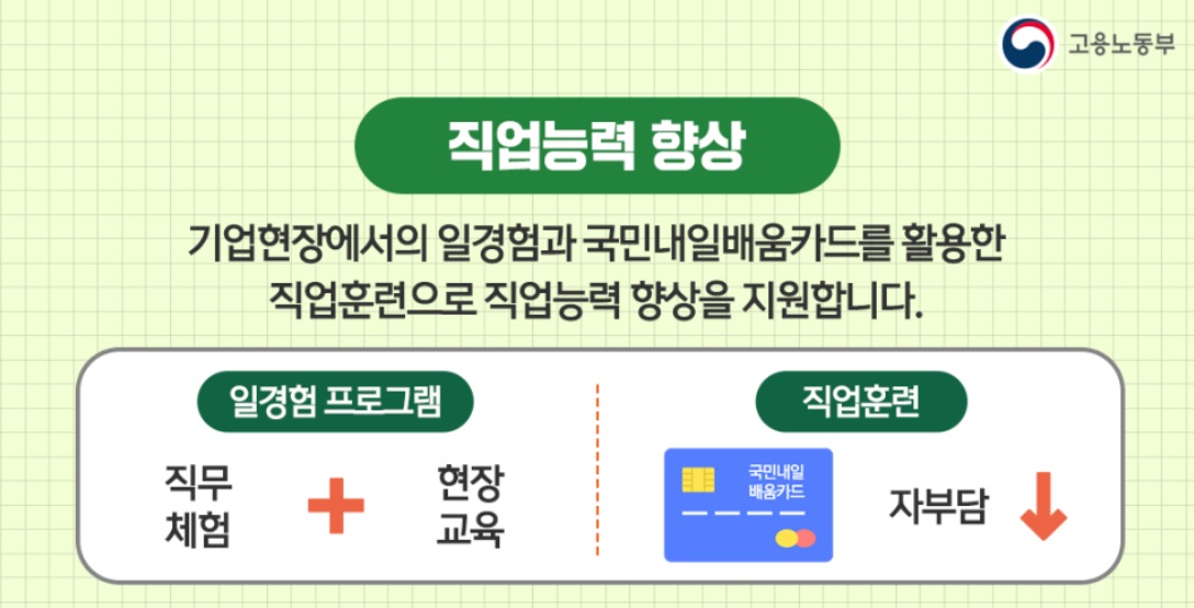 뿐만 아니라 기업현장에서의 일경험과 국민내일배움카드를 활용한 직업훈련으로 직업능력 향상을 지원하며, 내게 적합한 기업을 알선하고 취업에 필요한 이력서 및 면접 기술을 향상시켜 줍니다.
