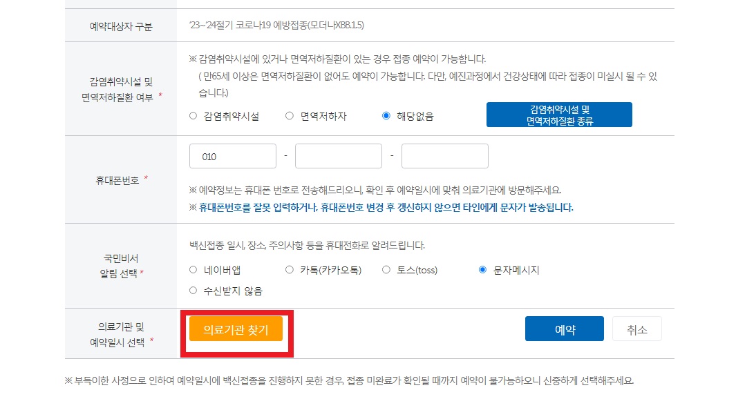 그리고 본인이 원하는 코로나 예약접종 날짜와 병원 확인 문자를 받을 휴대폰 번호를 입력하고, 안내 받을 알림 방법을 선택하시면 됩니다.
