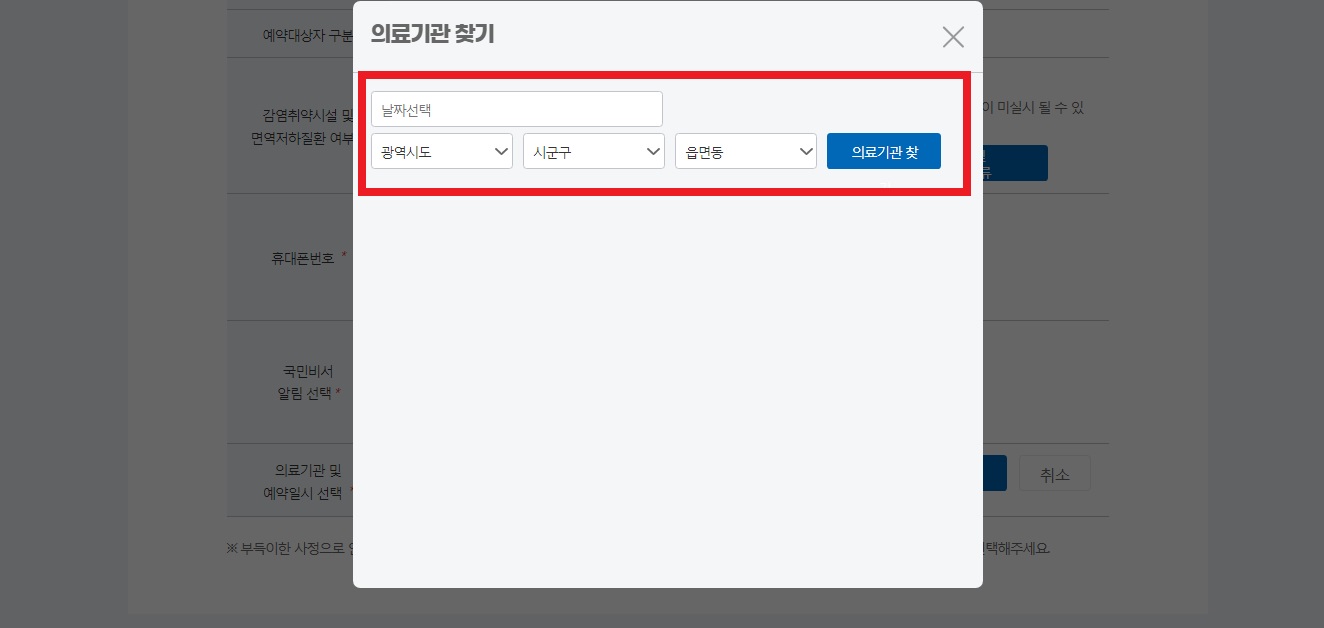 그 후 의료기관 찾기를 누르고, 가장 먼저 날짜를 선택합니다. 건강취약계층이 아니신 분들은 11월 1일부터 코로나 예약접종 가능합니다.