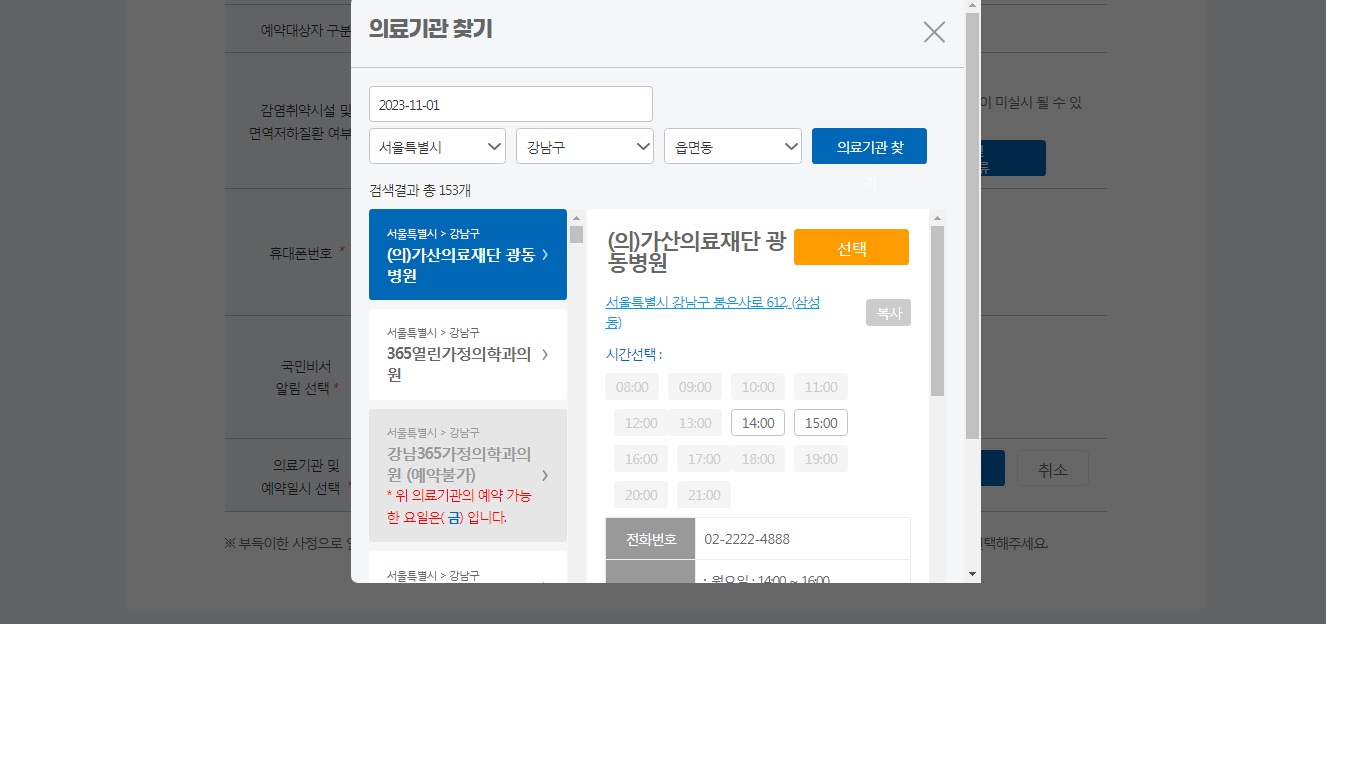 날짜 선택 후 지역을 선택하면 코로나 예방접종 가능한 병원 목록을 뜹니다. 원하는 병원 클릭하고 시간을 확인하여 예약을 원하는 시간대를 누릅니다. 그 후 선택을 눌러주시면됩니다.