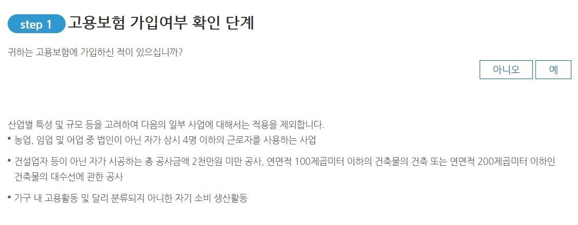우선 고용보험에 가입한 적이 있어야합니다. 해당한다면 예를 눌러주세요.