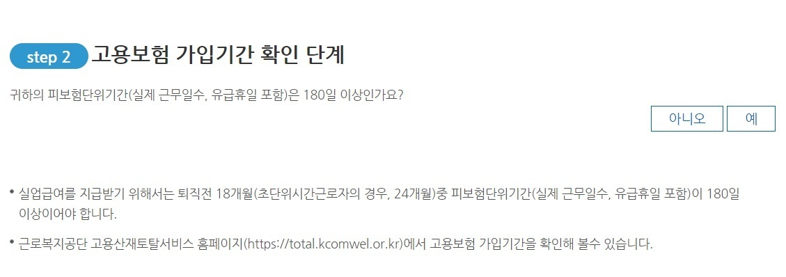 피보험단위기간이 총 180일 이상이여야합니다. 해당한다면 예를 눌러주세요. 구직급여를 수급하기 위해서는 퇴직전 18개월 중 피보험단위기간이 180일 이상이여야합니다.