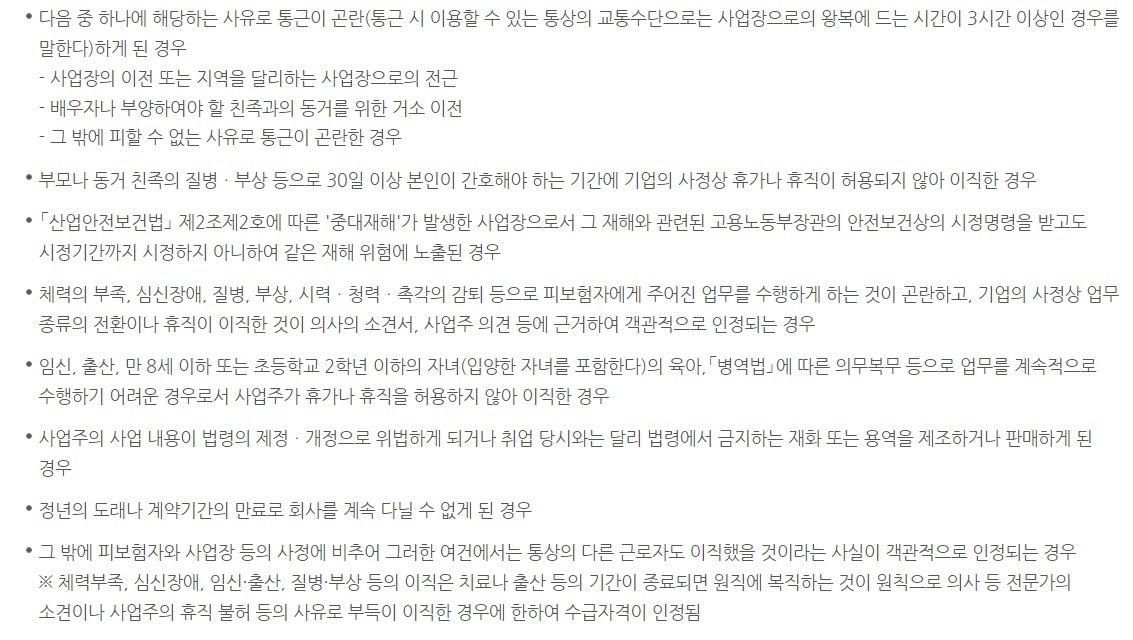 퇴직사유가 정당한 사유에 해당해야합니다. 해당한다면 예를 눌러주세요. 정당한 사유는 계약기간만료, 권고사직, 인원감축 등이 있으며, 회사와의 출퇴근 거리가 왕복 3시간 이상이여도 정당한 사유로 봅니다. 더 자세한 퇴직사유는 고용보험 홈페이지를 통해 확인할 수 있습니다.