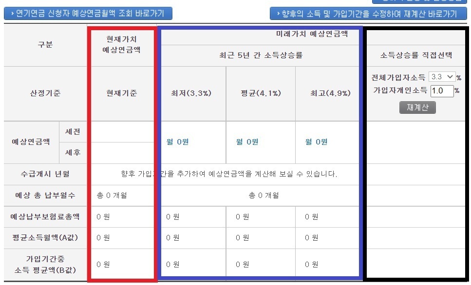 그리고 검정색으로 박스를 친 부분은 본인이 직접 소득상승률을 선택하여 국민연금 수령액을 알아볼 수 있습니다.