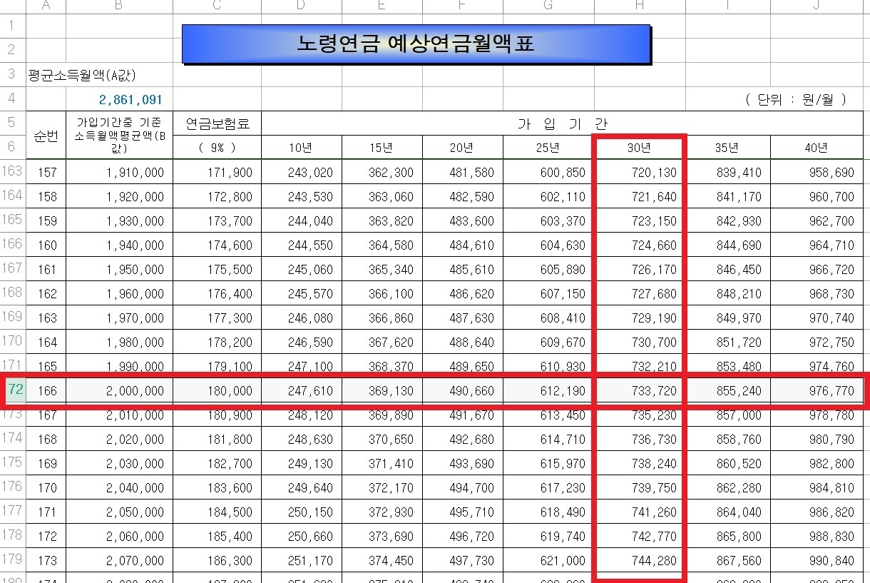 모바일로 보고 계시다면 사진이 잘 보일지 모르겠지만, 첫번째 사진의 경우 월 200만원 급여의 경우 매월 납입하는 연금액은 180,000원으로 30년간 납입을 한다면 733,720원을 매월 지급받을 수 있습니다.