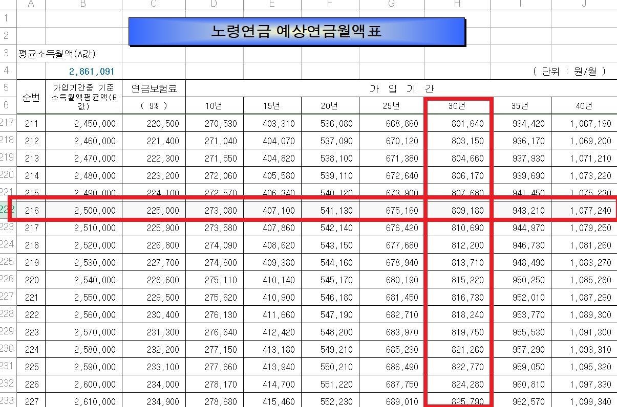 두번째 사진의 경우 월 250만원 급여인데요, 국민연금 월 납입금이 225,000원으로 30년 기준 809,180원을 평생 지급 받을 수 있습니다. 평균적인 중소기업 월급이라고 생각이드는데요, 30년을 근무해도 사실 노후를 완벽히 보장받기는 힘들다는 생각이 듭니다. 연봉협상도 한계가 있으니 기본 월급에서 많이 올라가기는 힘들다고 생각이 들기 때문이죠.