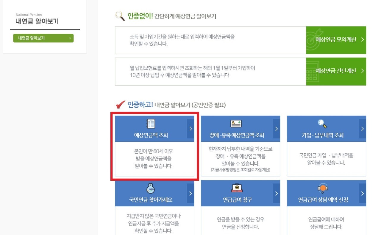 먼저 통하여 국민연금 수령액 알아보기 사이트에 접속해주세요. 그 뒤, 국민연금 예상연금액 조회에 들어가주세요. 그 다음 국민연금 예상연금액 알아보기를 누른 뒤 공인인증서 또는 간편인증으로 로그인해주세요.